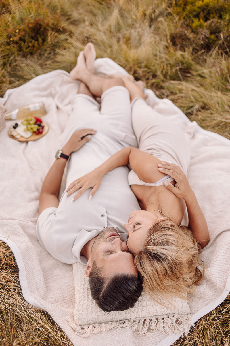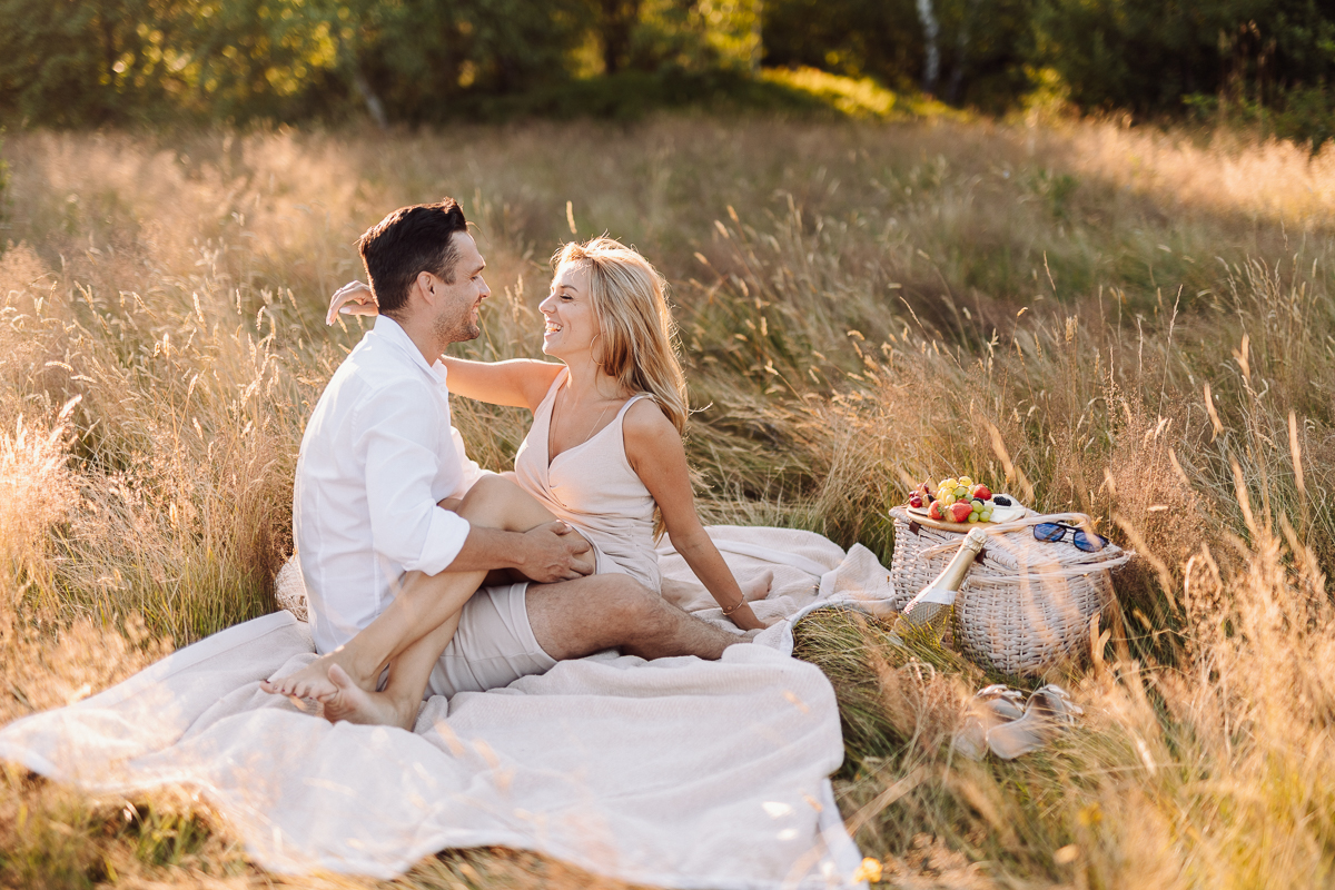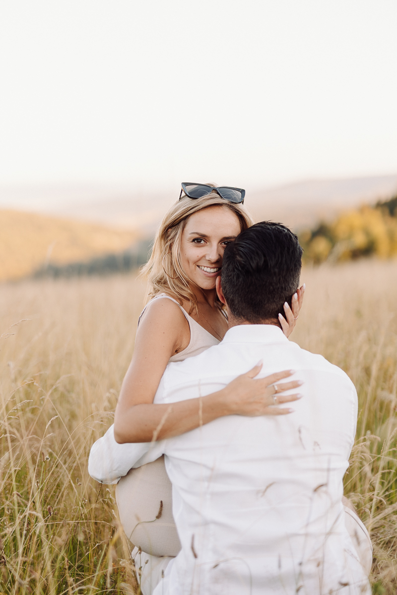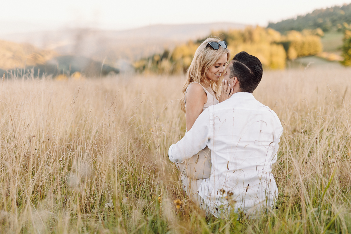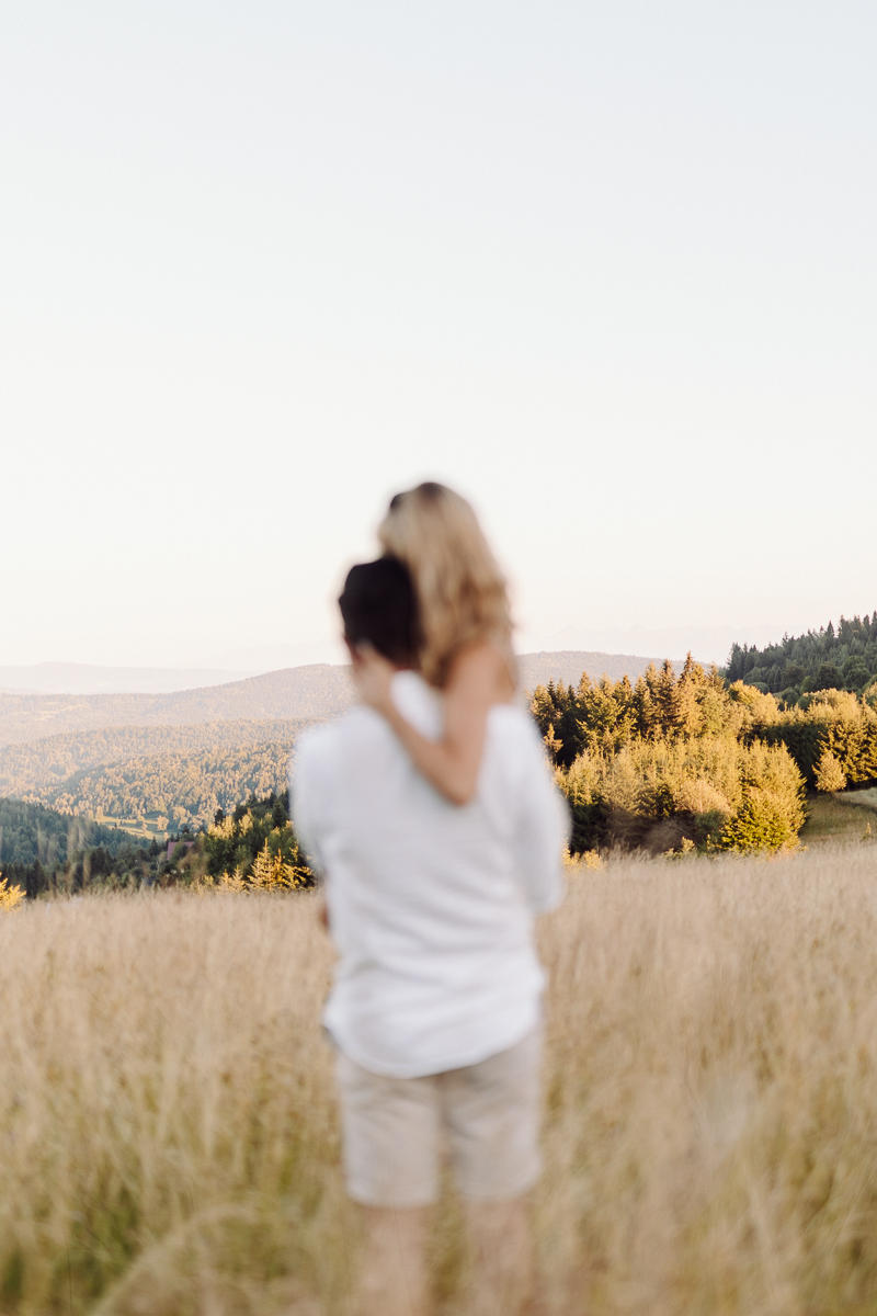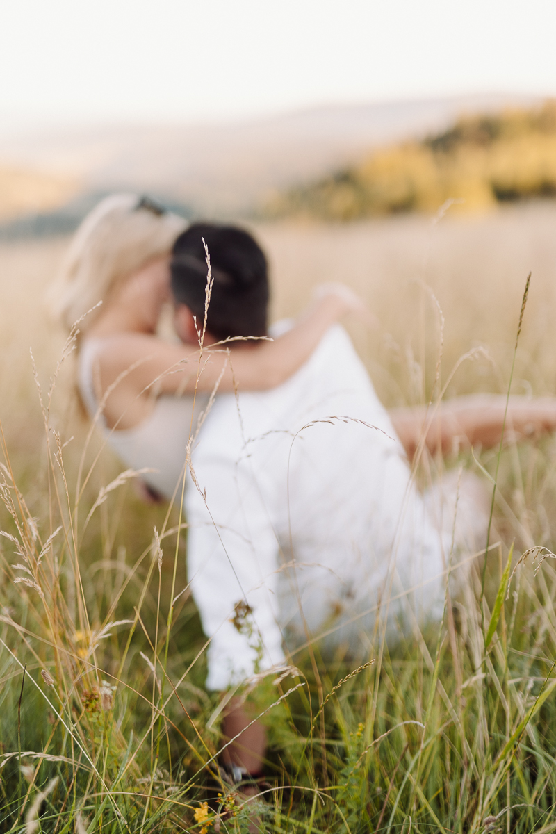 Angelika i Bartek nie mieli nic przeciwko, kiedy zaproponowałam im kilka godzin odpoczynku od przygotowań przedślubnych właśnie na sesji. Specjalnie udaliśmy się daleko w góry, w głęboki las, bez ludzi i zgiełku, do ciszy. Tak, żeby mogli odetchnąć, spędzić ze sobą trochę czasu bez ciekawskich spojrzeń innych ludzi, bez miliona pytań o przygotowania. Telefony schowali w samochodzie, wzięli koc i kosz piknikowy z dobrym jedzeniem w ręce i po prostu byli ze sobą godzinę czy dwie. Czas nam się trochę zatrzymał 🙂